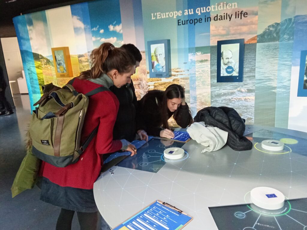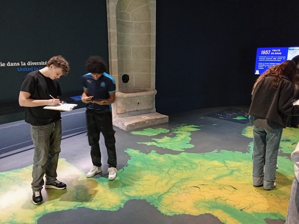 Pour aller déjeuner, ils ont marché dans la capitale entre l’Assemblée Nationale et la place de la Concorde. Puis, ils sont allés à l’exposition immersive sur le Parlement européen. Accueillis par les médiatrices du lieu, ils ont vu un film présentant le fonctionnement du Parlement européen et ont pu remplir un questionnaire à l’aide notamment d’une carte d’Europe interactive.
